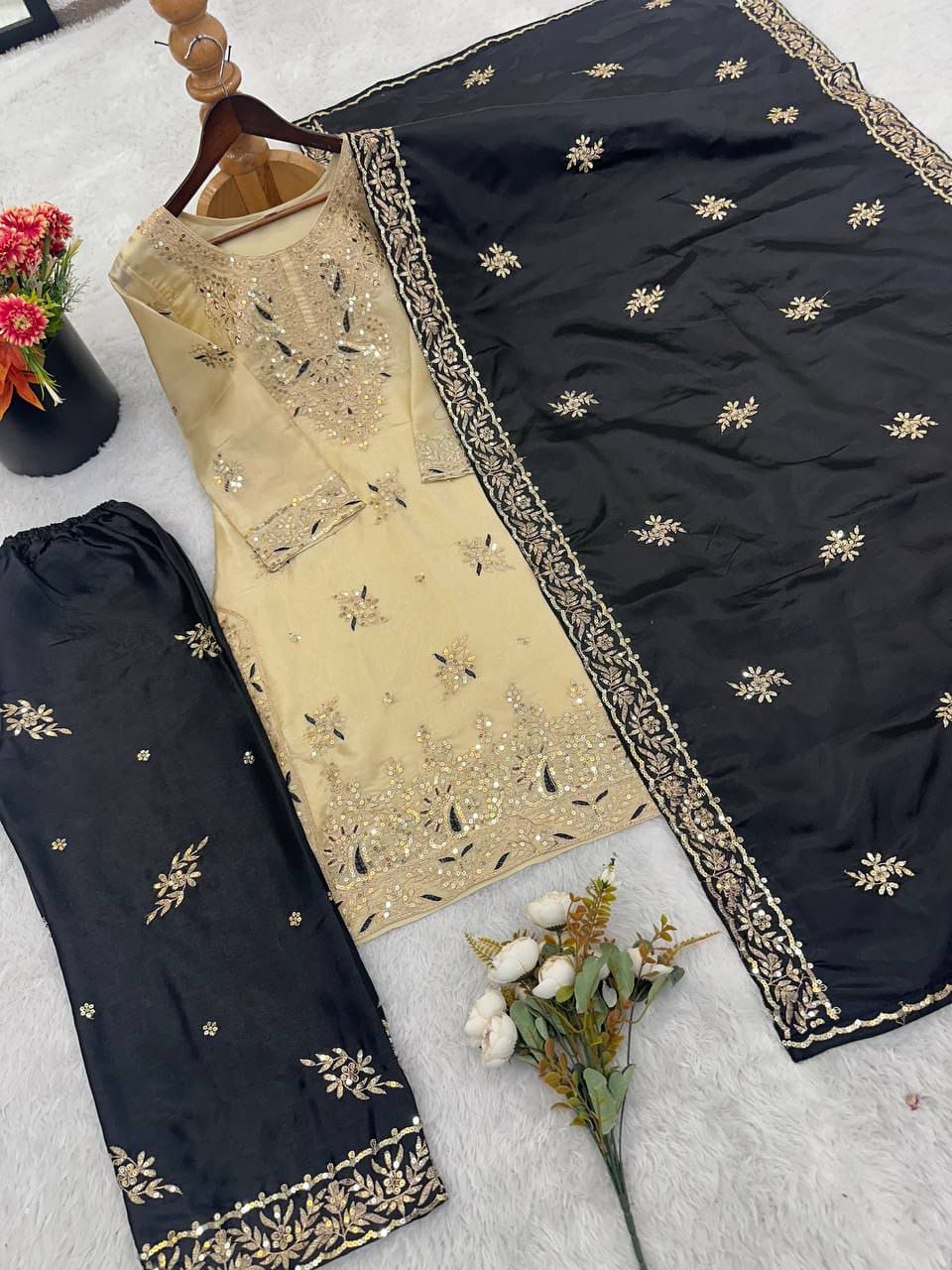 Palazzo fabrics – gmy silk with digital print and embroidery sequence work with elastic