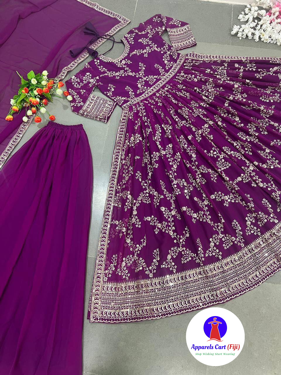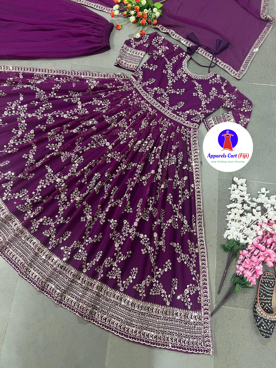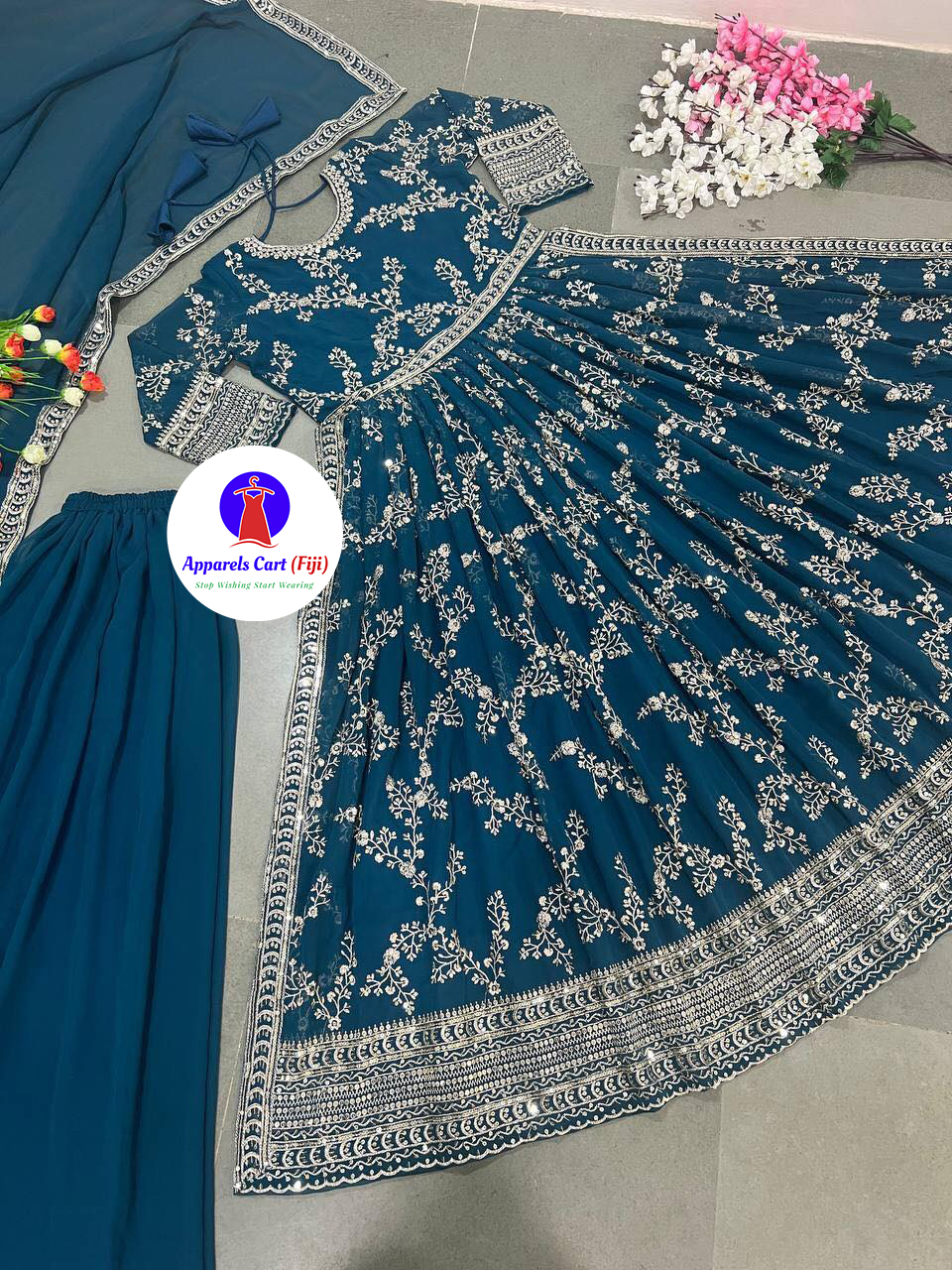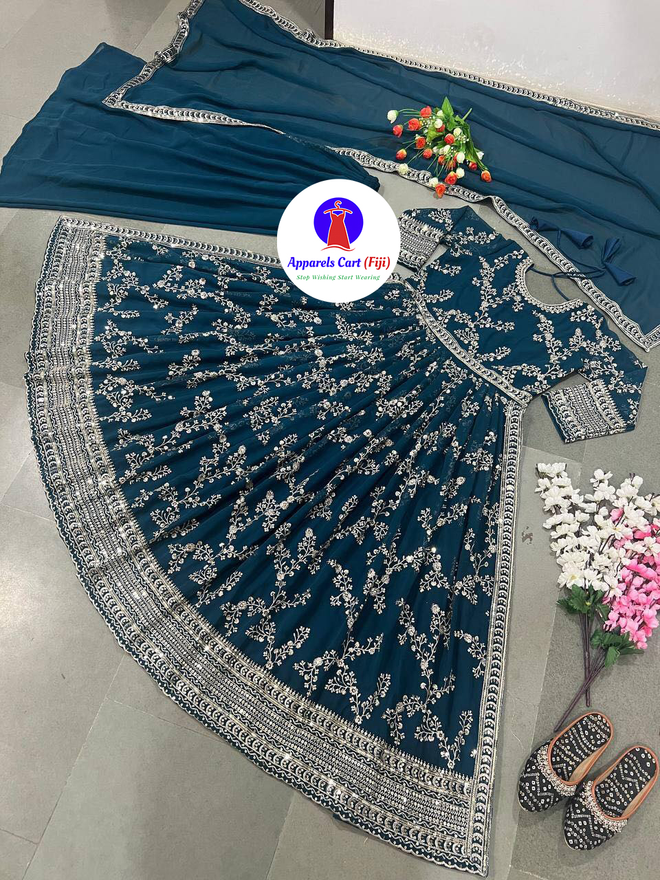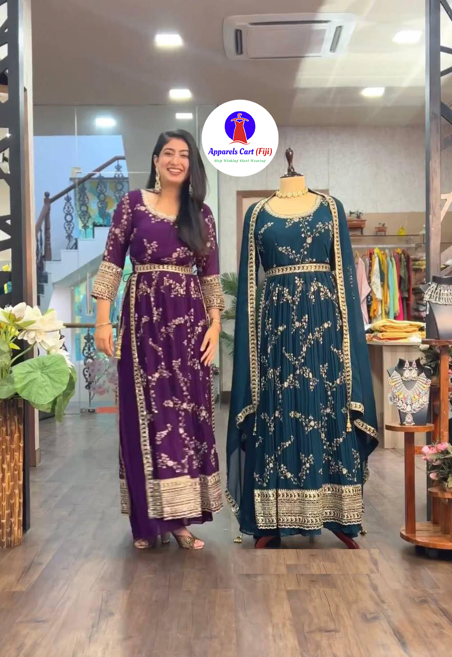Top fabric – heavy faux georgette with embroidery, heavy embroidered sequence work, sleeve and latkan dori with full 2.5 meters flair in naira cut style
