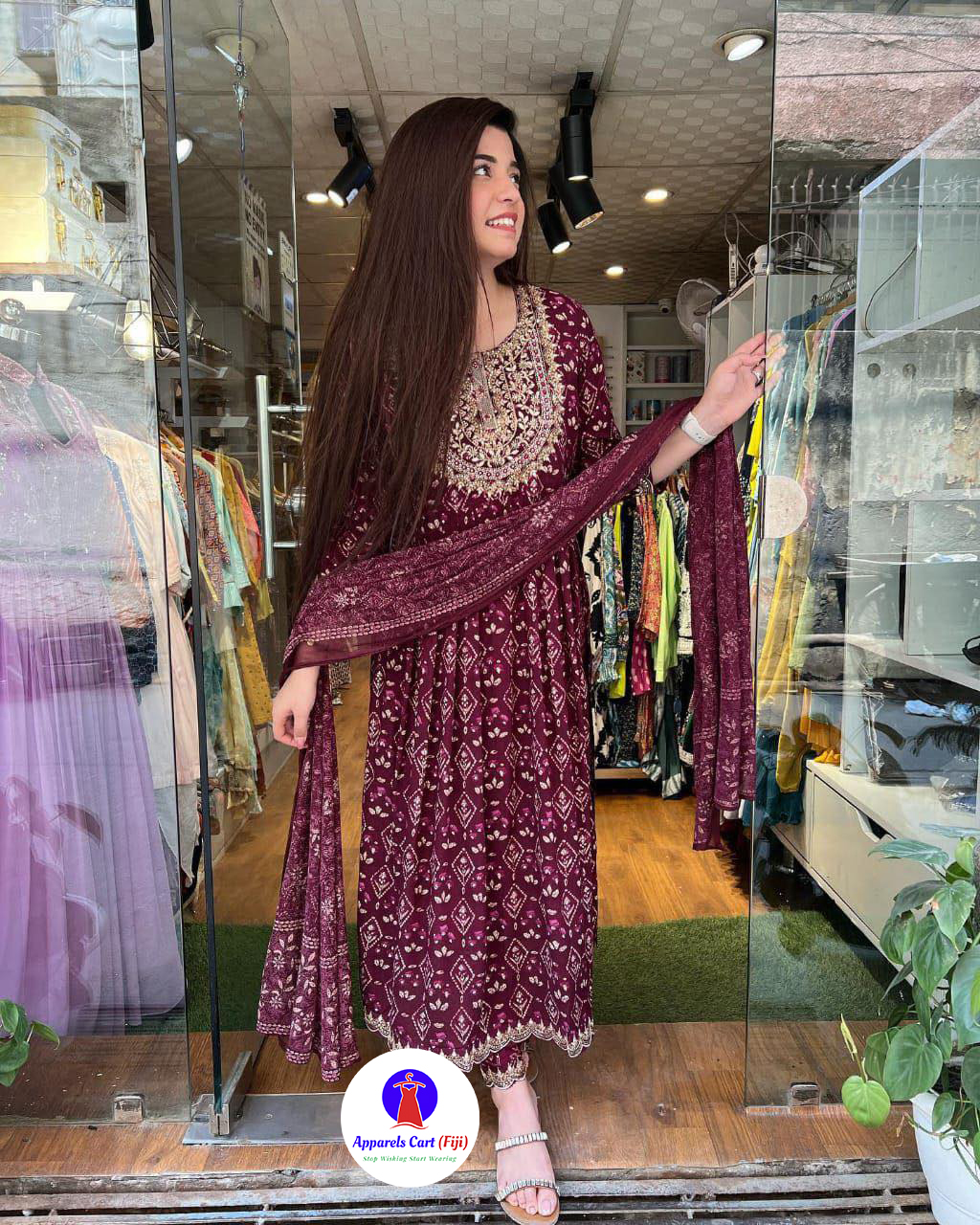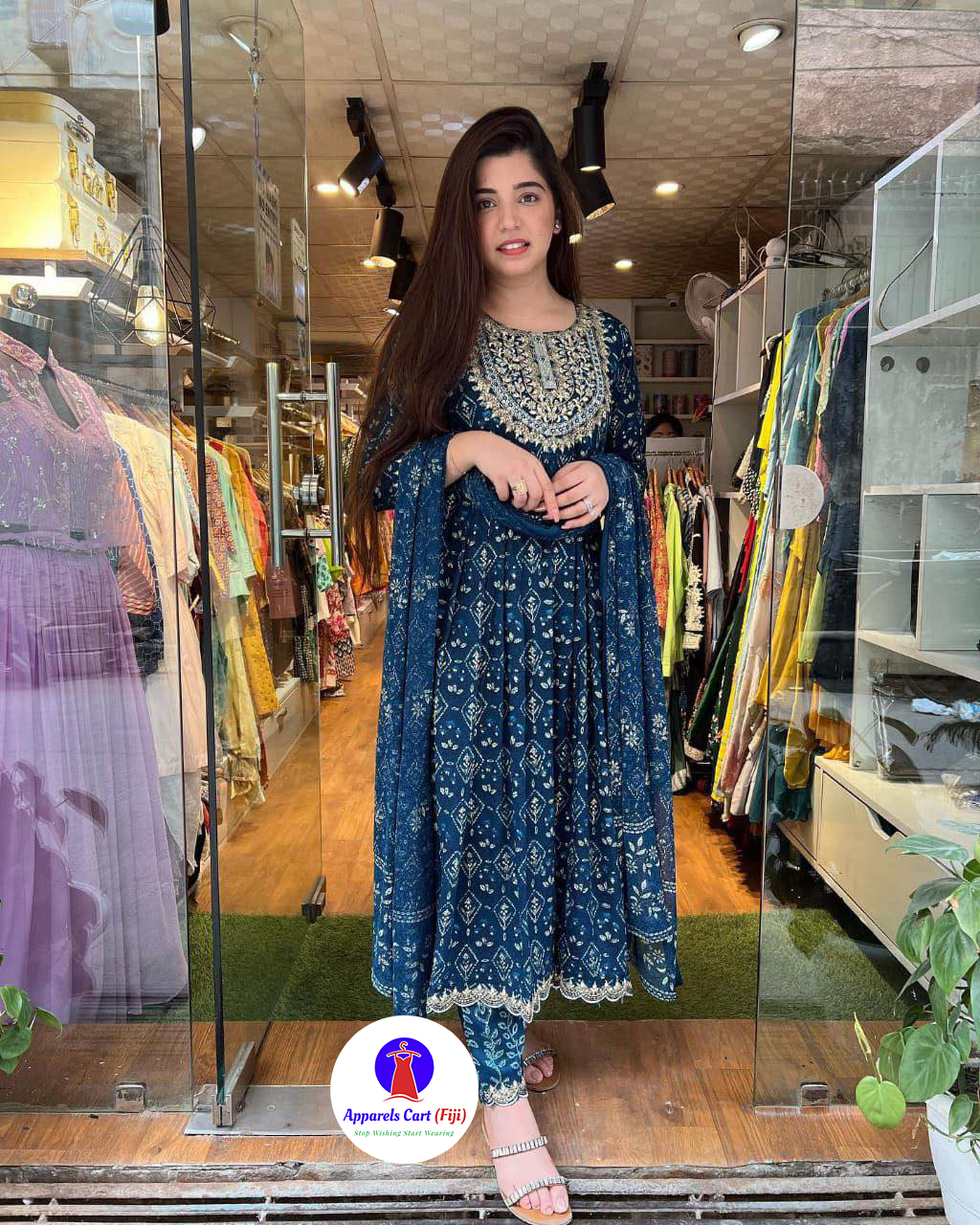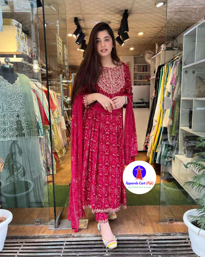 Design – printed kurta with machine embroidered detailing on both kurta and pant