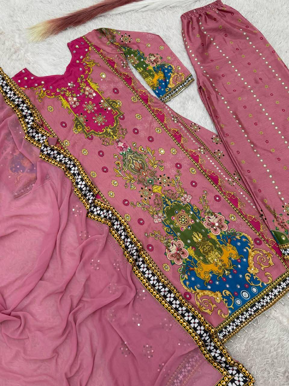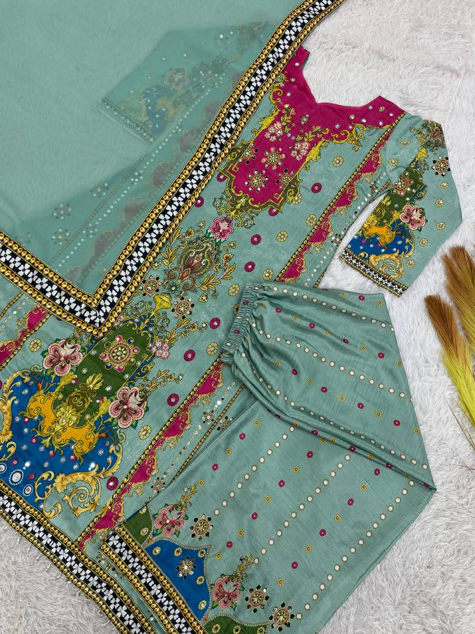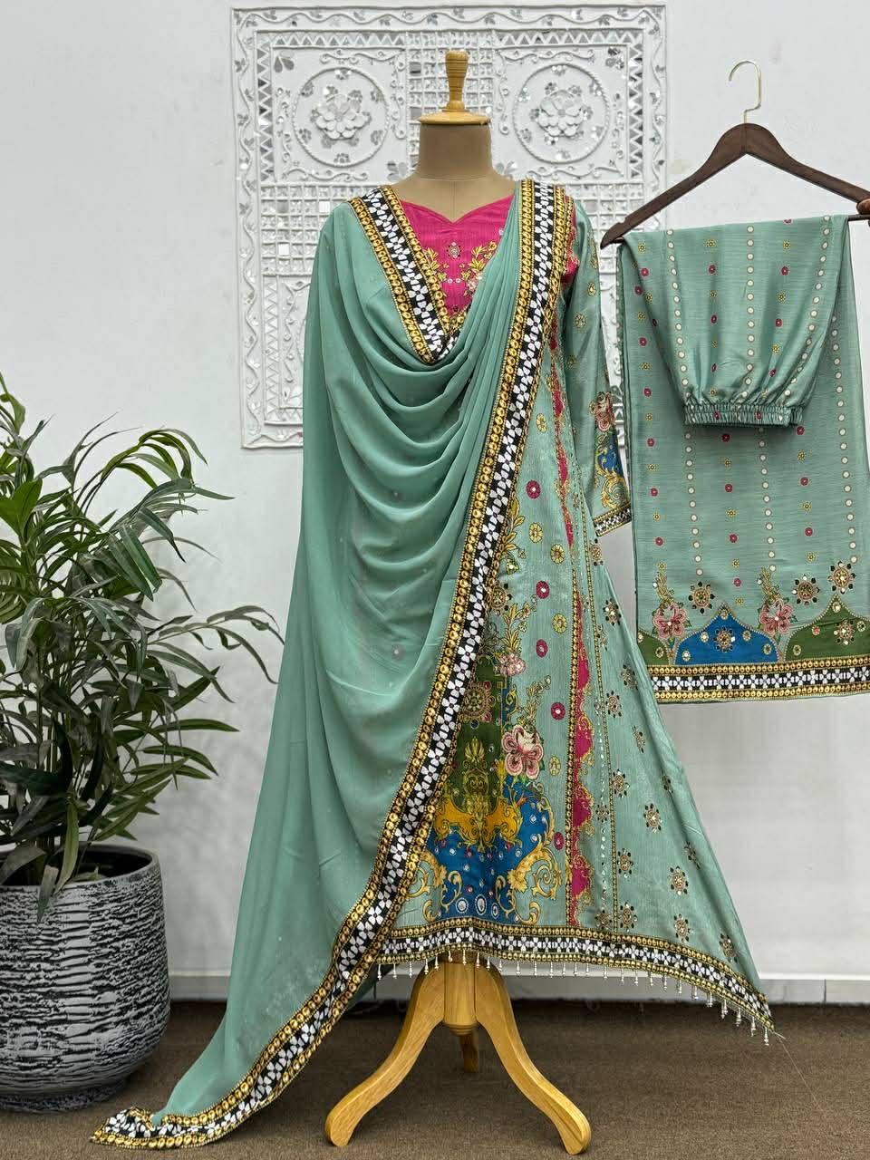 Work – beautiful digital print with real mirror hand work.and hangings lace border